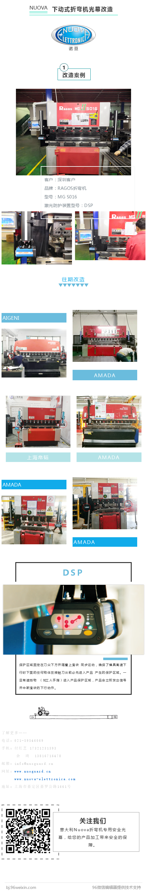 诺亘(上海)工业自动化有限公司是一家集研发、生产(委托生产)、销售为一体的高新技术企业。主导产品为折弯机专用激光安全保护装置,板料伴随系统,激光位置定位系统,角度检测系统等,产品主要用于保护操作工在生产中的安全,有效防止工伤发生;节省人工成本;提高生产效率;保证折弯过程...